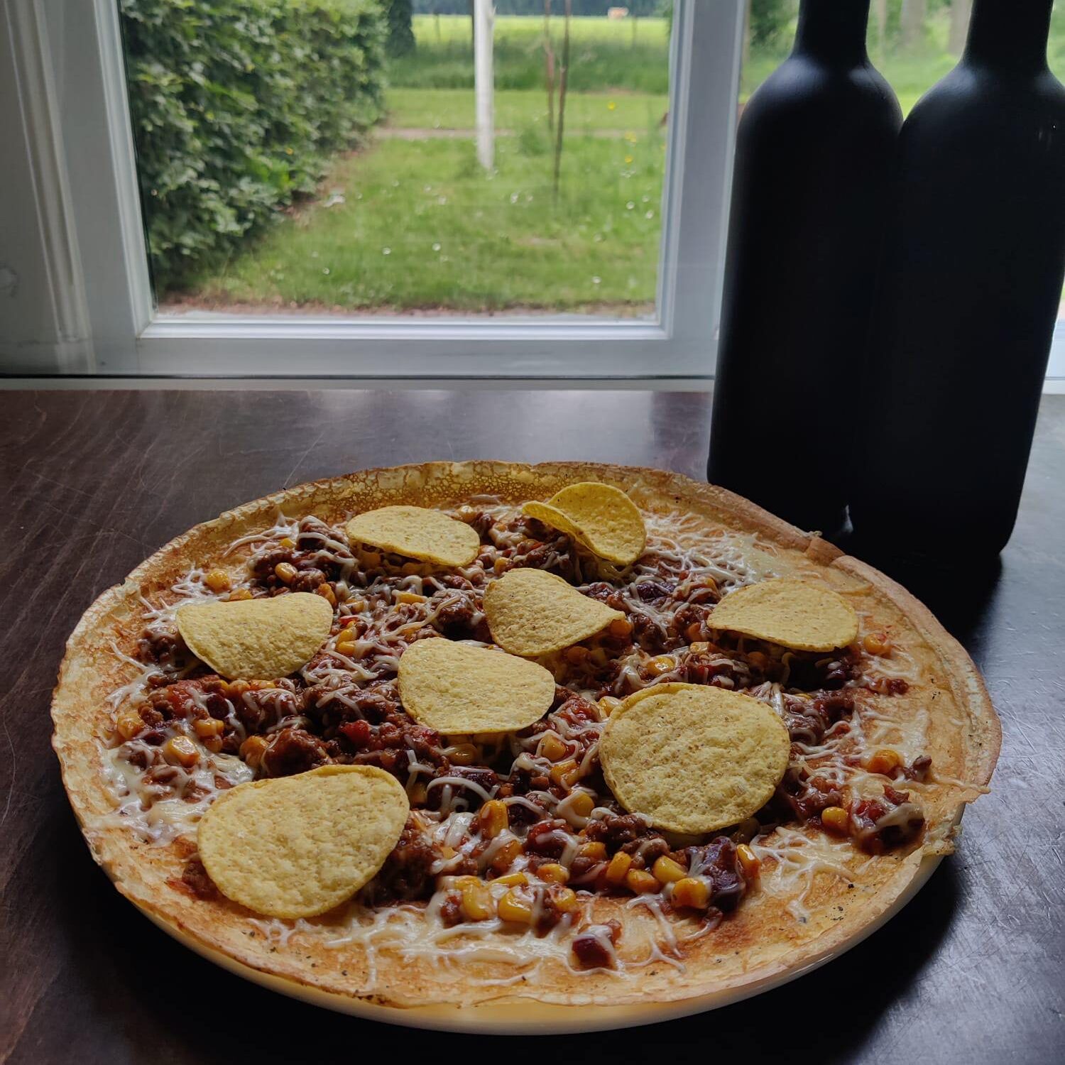 - Pannenkoek TEX MEX met mexicaans gekruid gehakt, mais, bonen, kaas en tortilla soep